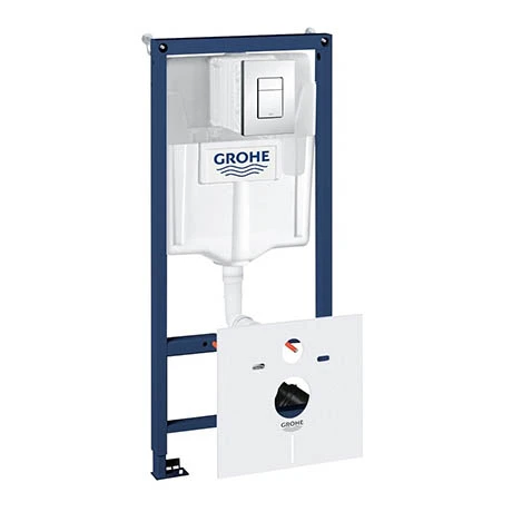 The Rapid SL Low Noise 3 in 1 Set Support Frame for Wall Hung WC gives you the freedom to design your ultimate bathroom by providing a secure and quick method of installing WCs. Complete with the Skate Cosmopolitan chrome flush plate, it features GROHE Whisper®, preventing any sound from traveling to adjoining rooms while GROHE EcoJoy® flush technology reduces your water consumption by up to 50%. The GROHE Fresh feature allows you to open the flush plate to insert toilet freshener tabs directly into the tank. The dual flush system provides two buttons, allowing you to select a flush volume of either 3 or 6 liters (or 3 and 4.5 liters, depending on the ceramic body). Each frame comes pre-assembled with sanitary ware fixings and is subject to stringent testing – Grohe WC frames are tested to hold 400kg.