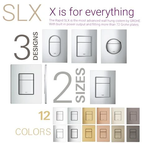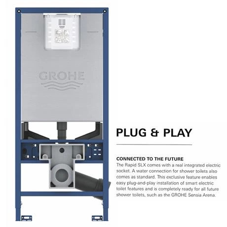 The sleek and robust Rapid SLX 1.13m Support Frame for Wall Hung WC. Rapid SLX has an attractive powder-coated steel frame which is TÜV approved for a load of 400kg. The unique flow manager means you can easily adjust the water flow so it can also be used with any new toilet, including rimless WCs, which use water under less pressure. The Plug & Play design includes an electric socket and water connection so you can easily add a shower toilet while GROHE Whisper technology helps stop sound travelling through walls when the flush is used.